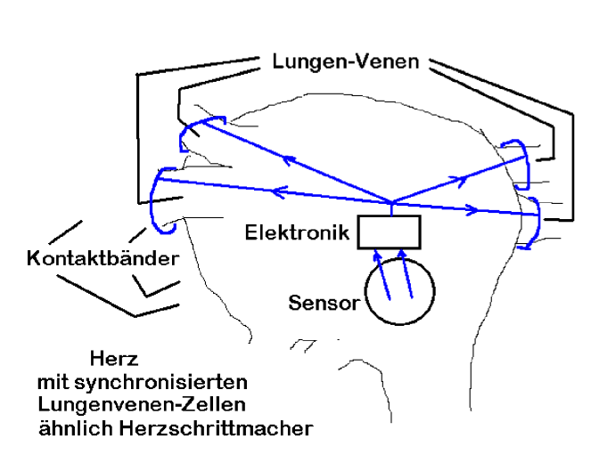 Letzte Änderung / Last update: 2025-Dez-21 Vorhofflimmern[WP Vorhofflimmern] ist eine Herzrhythmusstörung, die bis zu 2 % der Bevölkerung aufweist. Sie ist im täglichen Leben oft kaum merkbar, aber bei größeren Belastungen oder bei schwereren Formen werden die Leistungsfähigkeit und das Wohlbefinden erheblich eingeschränkt. Zusätzlich steigt das Risiko für weitere Herzschädigungen und für Schlaganfälle durch Blutgerinnsel, die sich damit vermehrt bilden können. Zum Glück ist das Vorhofflimmern etwas ganz Anderes als das "Kammerflimmern", wo nicht nur der Vorhof, sondern der komplette Herzmuskel in unregelmäßige Bewegung gerät, was innerhalb Minuten zum Tod führen kann. Als Ursache für ein Vorhofflimmern wird in der Regel festgestellt, dass elektrische Störimpulse von außen in das Herz eingespeist werden, die die interne Herzschlagsteuerung durcheinanderbringen. Und zwar geschieht das über die Lungenvenen, die das frisch sauerstoffbeladene Blut von der Lunge zum Herzen leiten. Es gibt vier solcher Lungenvenen, zwei auf jeder Seite, und sie führen auf der Rückseite des Herzens praktisch horizontal an den linken Herz-Vorhof. Es können alle vier Venen beteiligt sein, aber auch weniger. Durch diese Störimpule schlägt das Herz insgesamt ungeregelter, unruhig, es stolpert. Das verringert natürlich die Leistungsfähigkeit.Wikipedia-Bild: Herz und Lungenvenen (zu "Ablation" s. u.), Wikipedia-Bild: Herz von hinten und Lungenvenen, die "pulmonary veins" Wodurch diese Störimpulse in den Lungenvenen oder in der Lunge selbst entstehen, scheint bisher nicht bekannt zu sein. Hausaufgaben für die ForschungsgemeindeDas erscheint mir eine erstaunliche und gefährliche Wissenslücke! Man muss doch solchen Erscheinungen auf den Grund gehen und die ursprünglichen Quellen dieser Fehlfunktionen ermitteln. Erst dann kann man doch eine effiziente Behandlung auswählen, die nicht erst an fernen Symptomen herumbastelt.